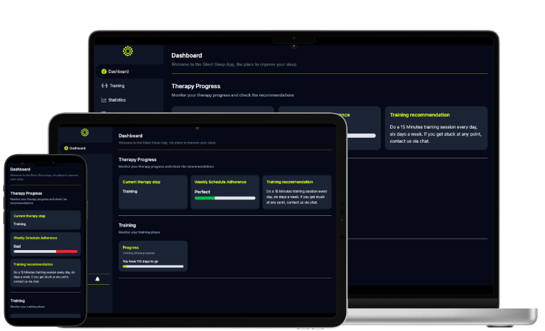 The Silent Sleep Training app uses artificial intelligence to analyze the sounds you produce and gives you real-time feedback. To make the training fun, you play a short game during a 15-minute training session. If you win the game, you are training your throat correctly. For those who don't like games, we have developed visual guides.